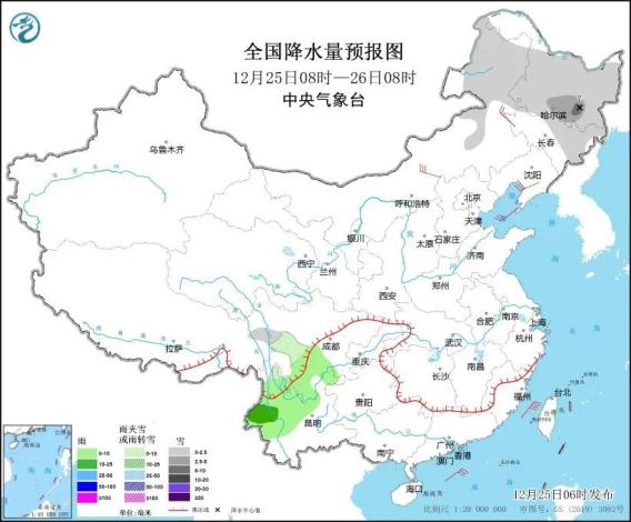 中央气象台预计,25日8时至26日8时,内蒙古东北部、黑龙江、吉林东部、川西高原南部等地的部分地区有小到中雪或雨夹雪,其中,黑龙江南部局地有大雪。云南西部和北部、四川南部等地的部分地区有小到中雨。