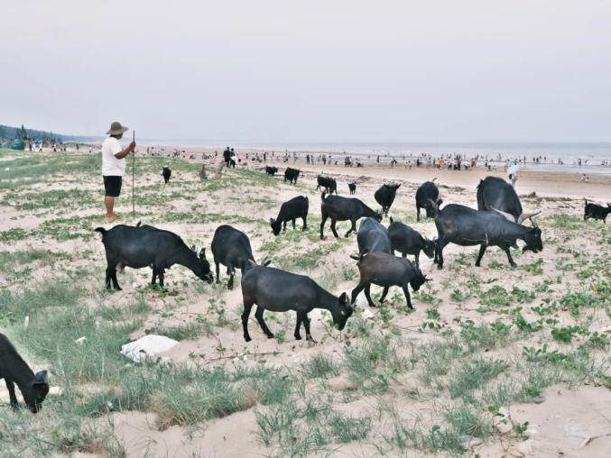 2022年9月10日中秋节,广东湛江吴川,吴阳金海岸海滩上的牧羊人,远处是中秋到海边游玩的人们。