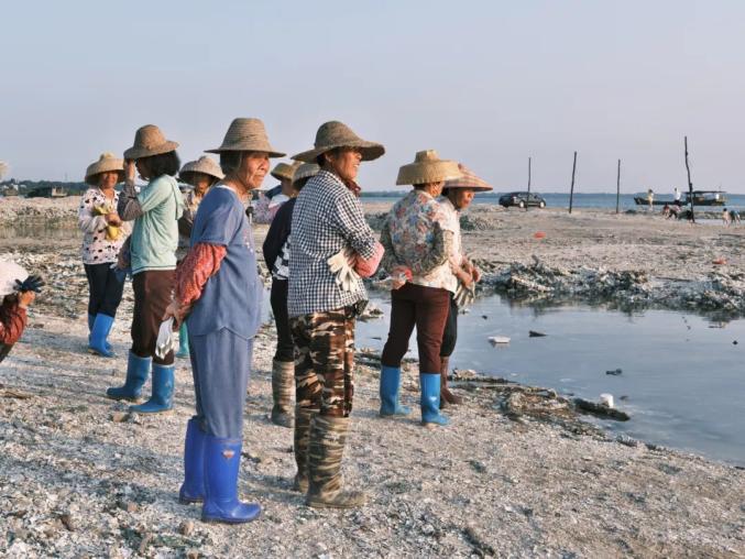 2022年5月4日,广东湛江遂溪北潭蚝场,一群老年妇女在等待蚝船归来。北潭镇有大量专业的生蚝养殖户,收蚝的时候镇上的其他人可去帮忙,按收蚝的重量给付工钱。