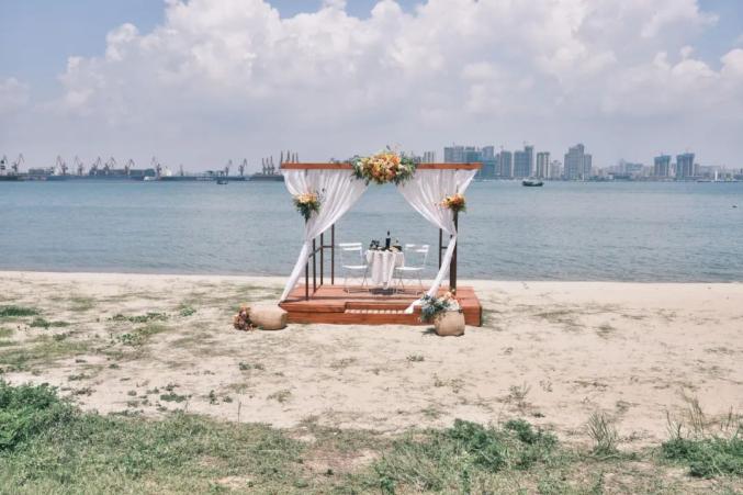 2020年8月22日,广东湛江霞山特呈岛,一个摆放在海滩上拍婚纱用的人造西式景点。
