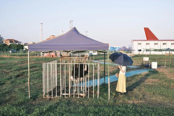 2021年10月6日,广东湛江吴川枚陈村,一名游客正在观看驼鸟。