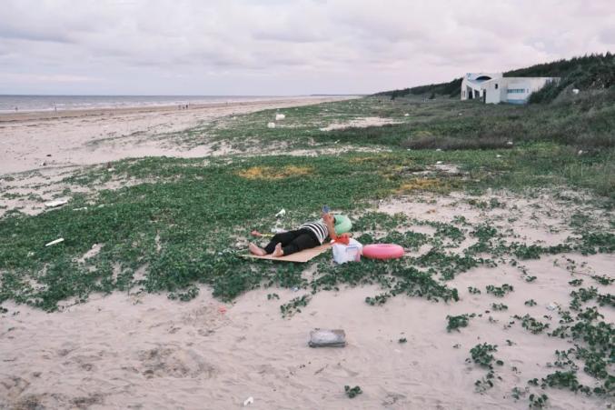 2020年8月15日,广东湛江吴川吴阳海滩,一个躺在海滩上看手机的游人。