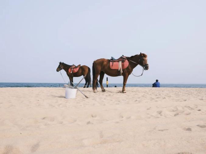2023年3月18日,广东湛江东海岛龙海天,海滩上等待游人来骑的两匹马。自从龙海天成为旅游区后,海滩上骑马是很受游人喜欢的娱乐项目。