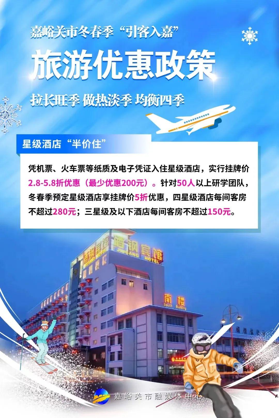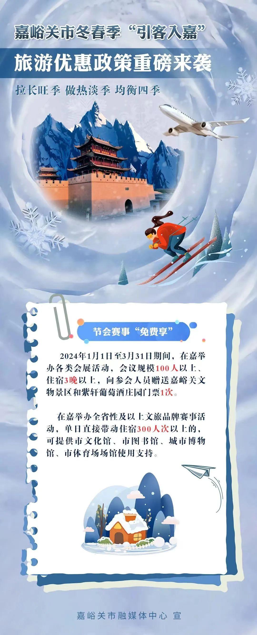 为进一步拓展冬春季旅游市场,激发文旅消费潜力和活力,自2023年12月1日起至2024年3月31日,嘉峪关文物景区门票半价优惠,同时嘉峪关市将通过发放文旅消费券等一系列优惠政策,为广大游客送上丰厚的“文旅嘉礼”。