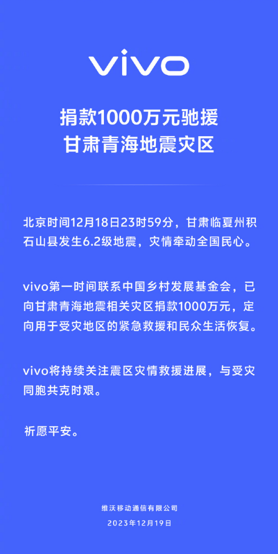 甘肃临夏州积石山县灾情牵动全国民心,vivo第一时间联系中国乡村发展基金会 ,已向甘肃青海地震灾区捐款1000万元人民币,用于抗震救灾。