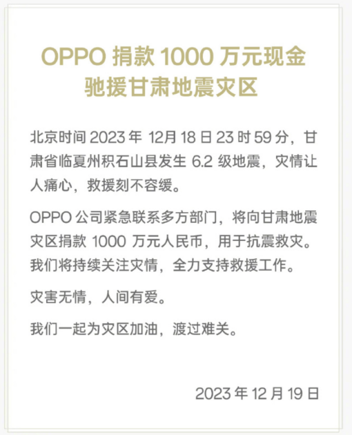 2023年12月18日23时59分,甘肃省临夏州积石山县发生 6.2级地震,灾情让人痛心,救援刻不容缓。OPPO公司紧急联系多方部门,将向甘肃地震灾区捐款 1000 万元人民币,用于抗震救灾。