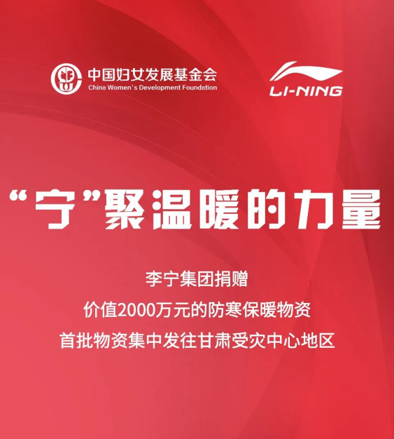 12月18日23点59分,甘肃临夏州积石山县发生6.2级地震。灾区地处高海拔地区,天气寒冷。李宁集团第一时间启动应急响应措施,通过中国妇女发展基金会,捐赠价值2000万元的防寒保暖物资。