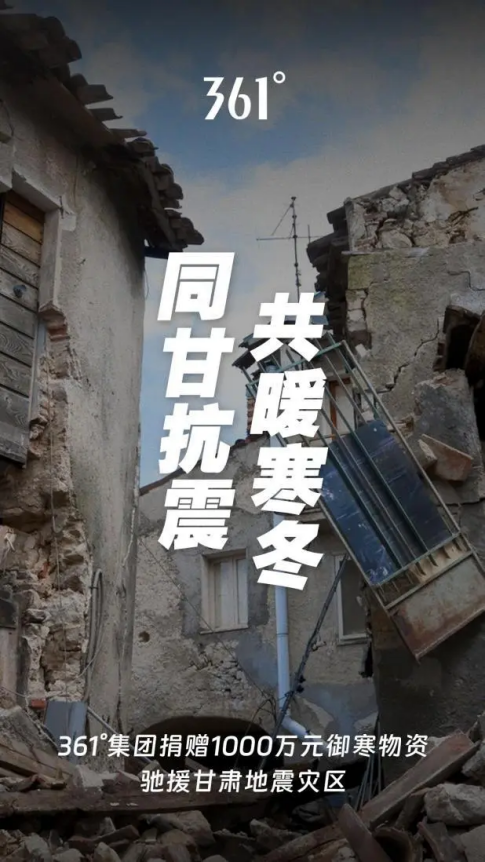 12月18日,甘肃临夏州积石山县发生6.2级地震,灾情牵动全国人民的心弦。作为一家负责任的民族品牌,361°集团迅速行动,贯彻落实集团“热爱计划”,第一时间通过甘肃省红十字会为灾区捐赠1000万元御寒物资,以实际行动支援抗震救灾工作。