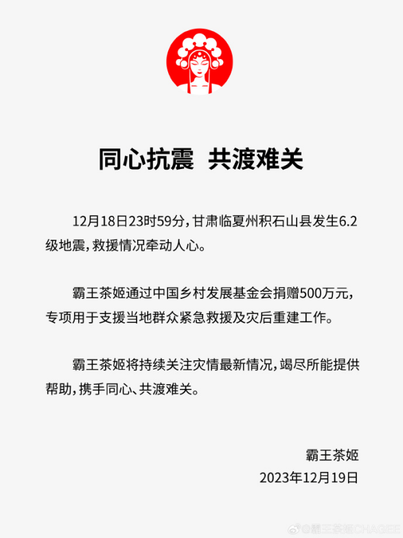 ·霸王茶姬宣布向甘肃地震灾区捐赠500万元