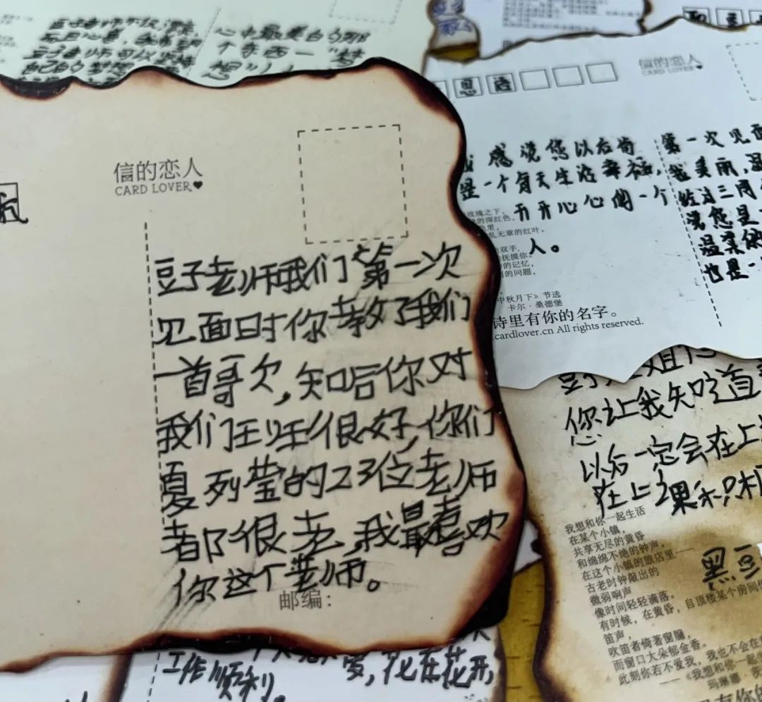 为支教老师写小卡片是学生们表达善意时约定俗成的方式。豆子收到的其中一张卡片上写着:“你们夏列(令)莹(营)23个老师都很老(好),我最喜欢你这个老师”。感动之余,卡片上歪歪扭扭的错别字让豆子为学生们薄弱的学习基础感到担忧。