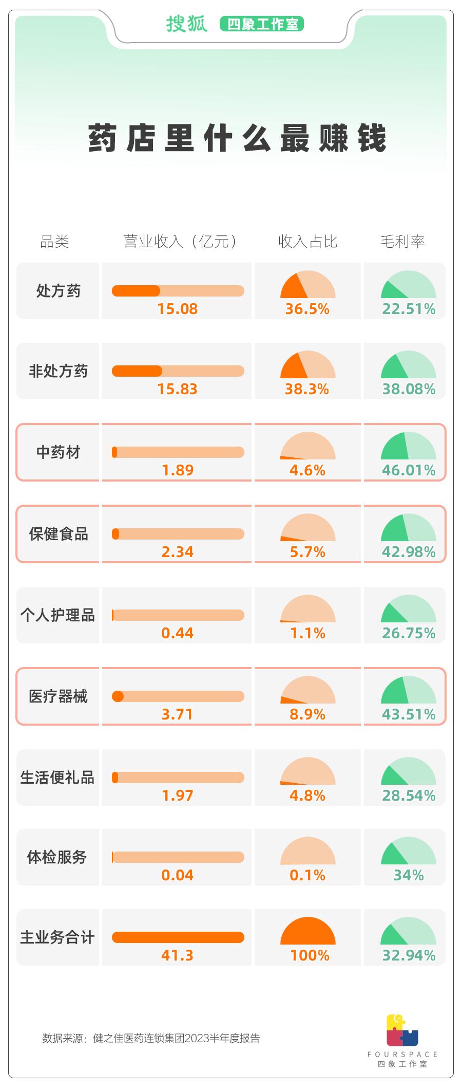 四象研读了国内知名连锁药店品牌“健之佳”发布的2023半年度报告,其中列举了药店在售品类的营业收入和平均毛利率。