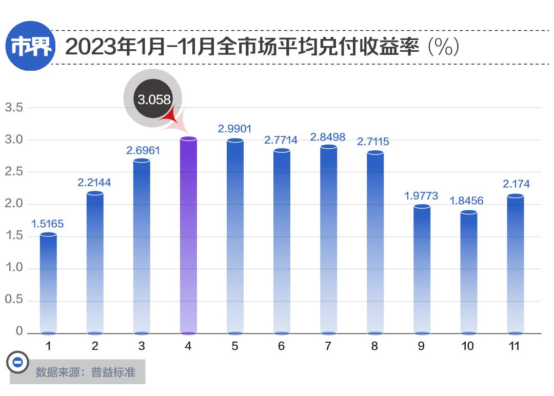 据普益标准研究员王杰观察,受股市下跌和债券市场波动的影响,2023年以来,理财产品收益率整体呈现出先升后降的走势。月度数据显示,前4个月理财产品收益率较去年年末有明显反弹。在后续月份,理财产品收益率则在波动中趋于下行,但波动情况仍显著优于去年。以理财产品的平均兑付收益率(年化)为例,4月份达到年内峰值,约3.058%,而11月份则已降至约2.174%。
