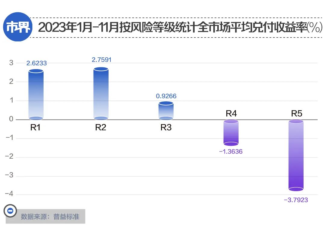 普益标准还显示,从不同风险等级来看,前11月R2级产品的兑付收益率最高,为2.7591%;R5级产品收益最低,为-3.7923%。