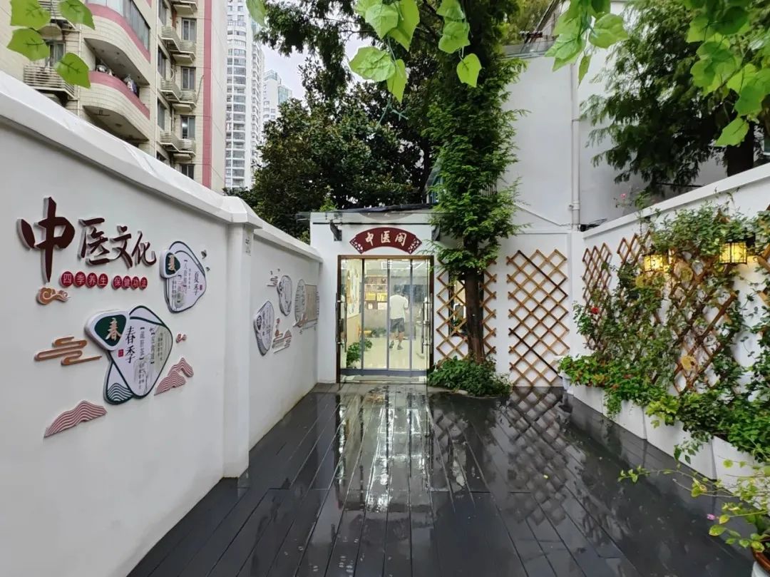 爬山虎缠绕木制大门,院内暖黄的灯倚着木制爬架,映照着架子上的草木葳蕤,对面一堵中医文化宣传墙古香古色,这便是天山街道社区卫生服务中心的联建社区卫生服务站。