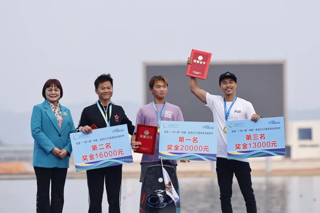 在当天下午进行的男、女子尾波决赛中,各代表队选手纷纷拿出看家本领,逐风踏浪、奔腾翻涌,以高难度的空中转体、浪底转弯等动作博得现场观众的热烈掌声。裁判员根据动作的技术难度和观赏性进行综合打分,最终,中国代表队选手徐露、于美玲、熊音茵包揽女子尾波决赛前三名;中国台北杨有烨、中国香港罗伟声、中国代表队张伟获得男子尾波决赛前三名,中国代表队选手共获得4枚奖牌,成为全场最大赢家。