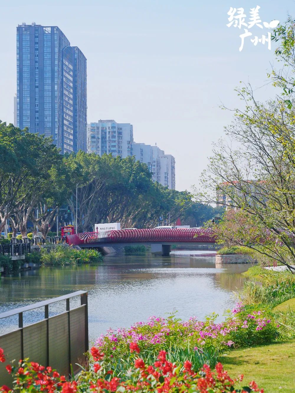 在这里,绿草红花、低空飞翔的白鹭清晰可见,美不胜收,碧道与国家版本馆广州分馆有机融合、相辅相成、和谐共生。