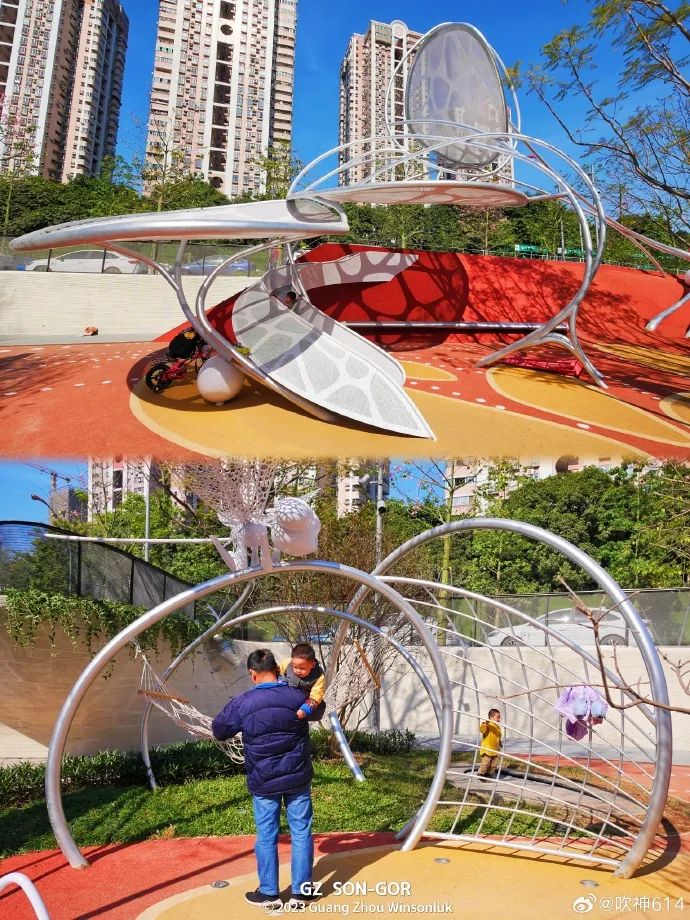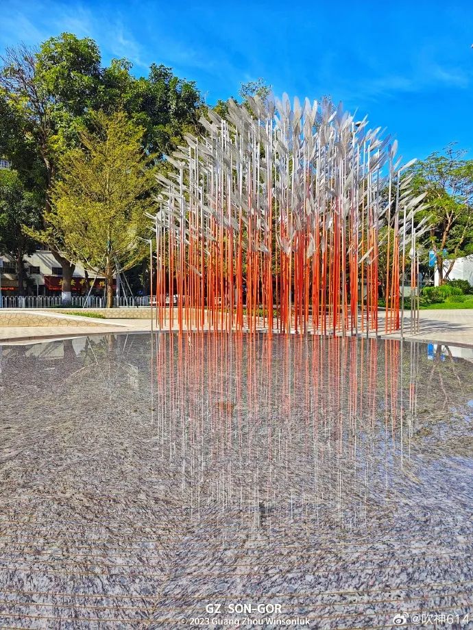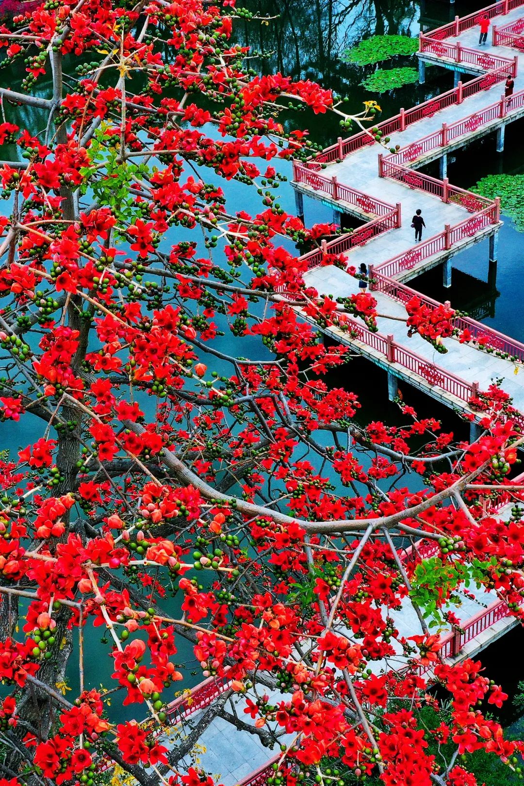 图/微博网友@吹神614“琼英荟”的概念取于“花田诗社”,以木棉花为灵感,营造连续的、流动的、交融的空间,以呼应传统的雅致生活;“飞花漫”观景塔的概念来源于清代梁修《花埭百花诗》,登高远望“群英荟”景亭、“小瓣飞”景桥共同组成的木棉花图卷,还原了岭南派国画大师赵少昂画作中的木棉笔意。