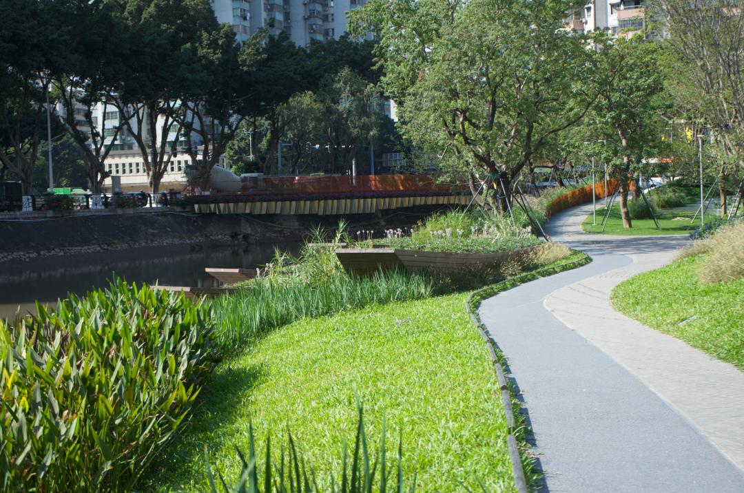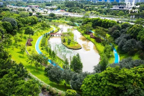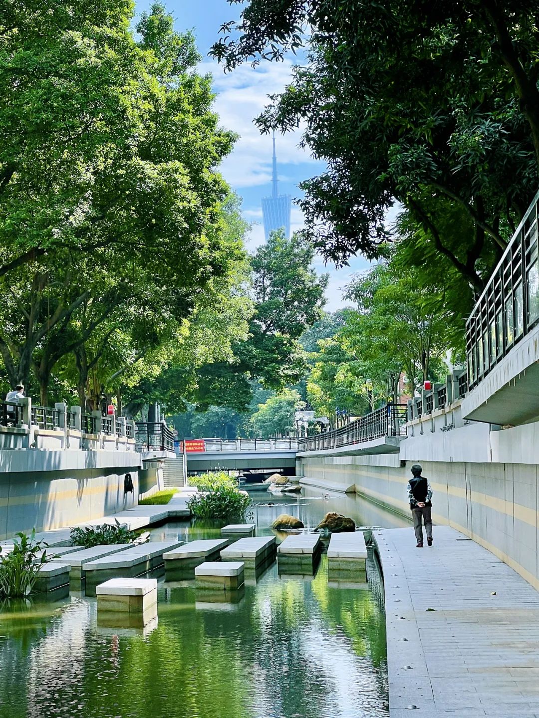 ▲猎德涌碧道绿树环绕,亭台楼阁、亲水平台连接成一个开放式滨水公园。