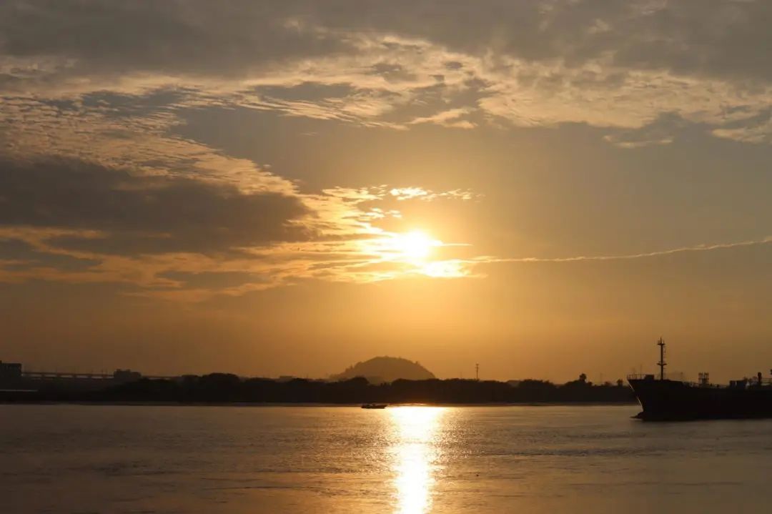 伴随着江上货轮的汽笛声,疾驰的列车点缀着夕阳,飞舞的鸥鹭被晚霞勾勒出金色的轮廓。
