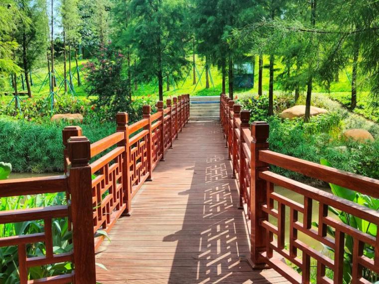 公园规划5大景观,其中“花渡头”景观节点概念取于清代方殿元《羊城花渡歌》,还原岭南盆景之乡“斗花局”的盛景,艺术化船艇造型花境种植池悬挑于水畔,重映古时水上花市的记忆。