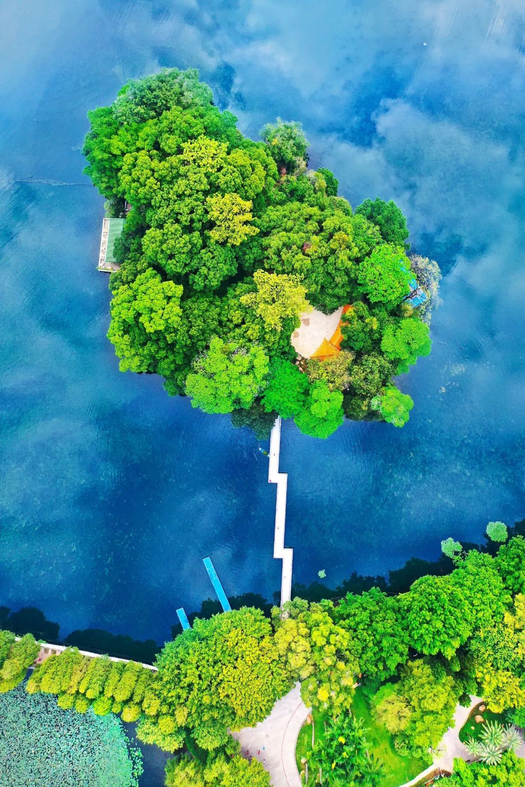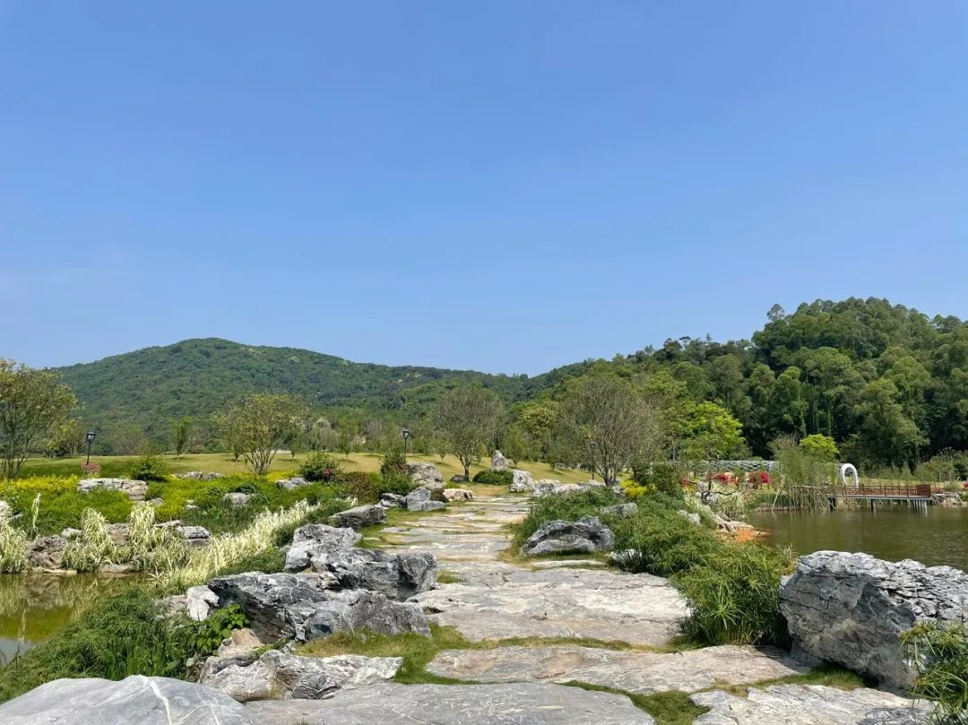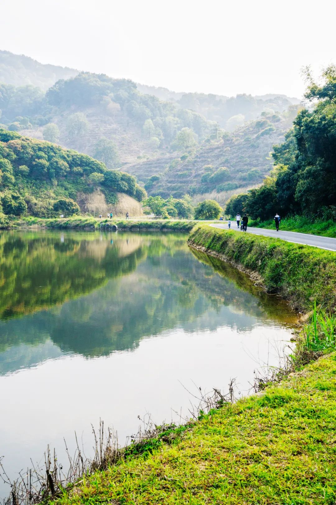 乘坐黄埔有轨电车1号线,在岭头东站下车沿温涧路步行,沿着蜿蜒的绿道走到湖边,蓝天白云倒映在清澈的湖水中,走在错落的石桥上,仿佛置身于水天之间。