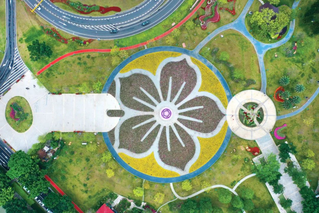 ▲二沙岛碧道旁有一个由鲜花组成的木棉花图案。