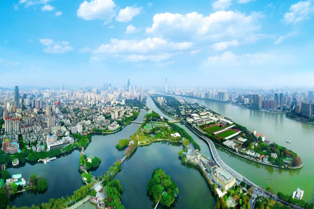 ▲从东山湖公园上空东望广州一河两岸美景,只见珠江与湖泊相连,碧空万里,水天一色。