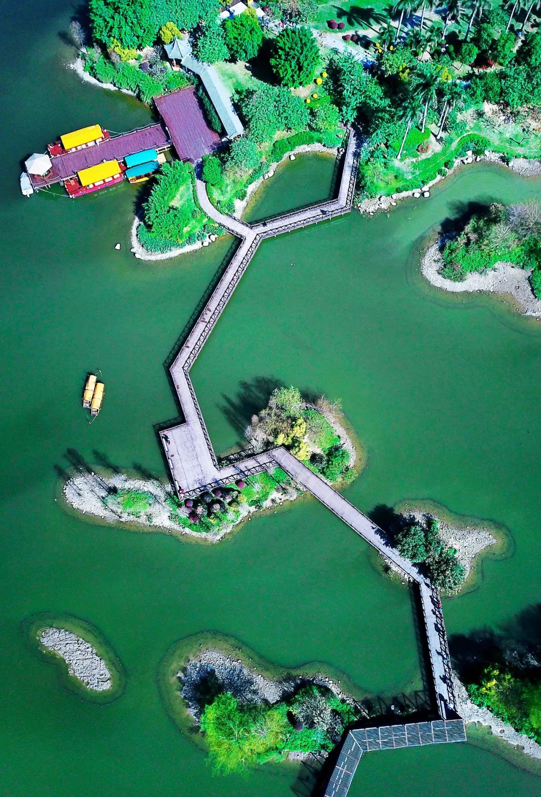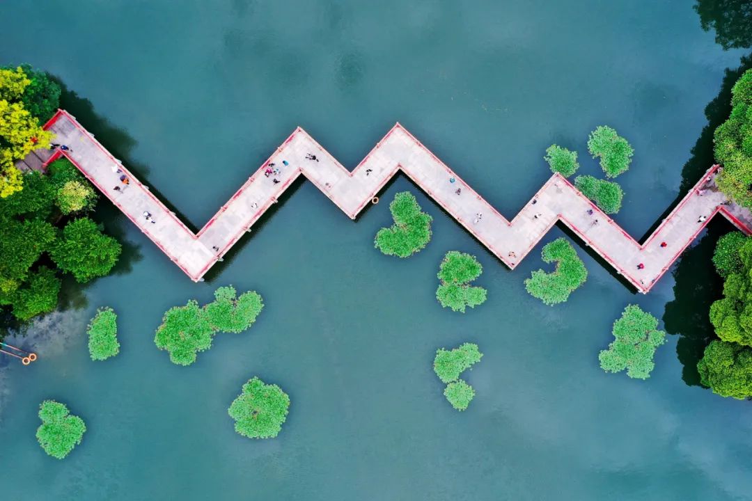 ▲东山湖公园的九曲桥造型独特,桥面迂回曲折,砌以淡红色栏杆,与绿水相映衬,把湖面点缀得更加艳丽多彩。