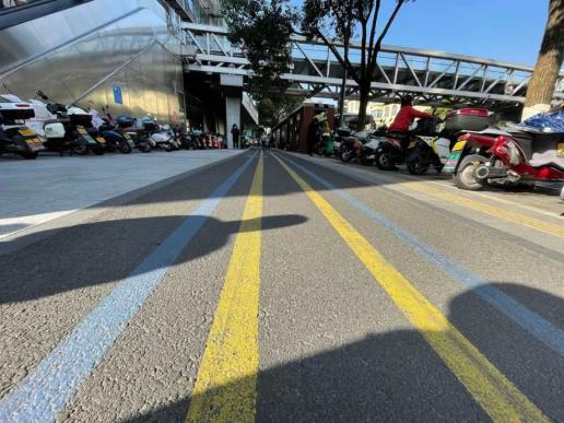 在启动本次靓化工程后,开始改造这段全长约300米的路段。为完善通行界面,道路空间再次被系统梳理,在满足通行功能的同时,也保障空间的整洁有序,移动了盲道,整治了无障碍设施,增加了泊车位,优化停车秩序,而原先非机动车道上的小方砖,现在也被改为了沥青混凝土材料,从而增强防滑性。此外,还增加了色彩的变化,创造积极、丰富、宜人的通行环境,并设置地面引导线,提醒市民文明出行。