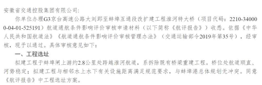 此前,安徽省交通运输厅公布了关于G3京台高速公路大刘郢至蚌埠互通段改扩建工程淮河特大桥航道通航条件影响评价的审核意见。意见表明,拟建工程于蚌埠闸上游约2.8公里处跨越淮河航道,系拆除既有桥梁重建工程。桥位处航道顺直、河势稳定;拟建工程与相邻水上水下有关设施距离满足规范要求,与蚌埠港总体规划无冲突。同意《航评报告》中工程选址方案。