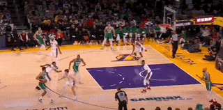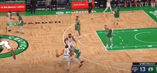 怀特的防无球同样值得信赖,看似在弱侧闲庭信步,实则看住了弱侧多个对手的接球线路。在特伦特切到弧顶的时候,怀特就预判到了西亚卡姆会给特伦特传球。