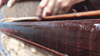 制作好抄纸帘就可以入池捞纸了,抄纸是最考验匠人手艺的时候,纸张的薄厚均匀与否全看这一步。捞出来的纸满是水分,一张一张叠放在一处,再用木板和大石块持续压十个小时以上挤干水分。