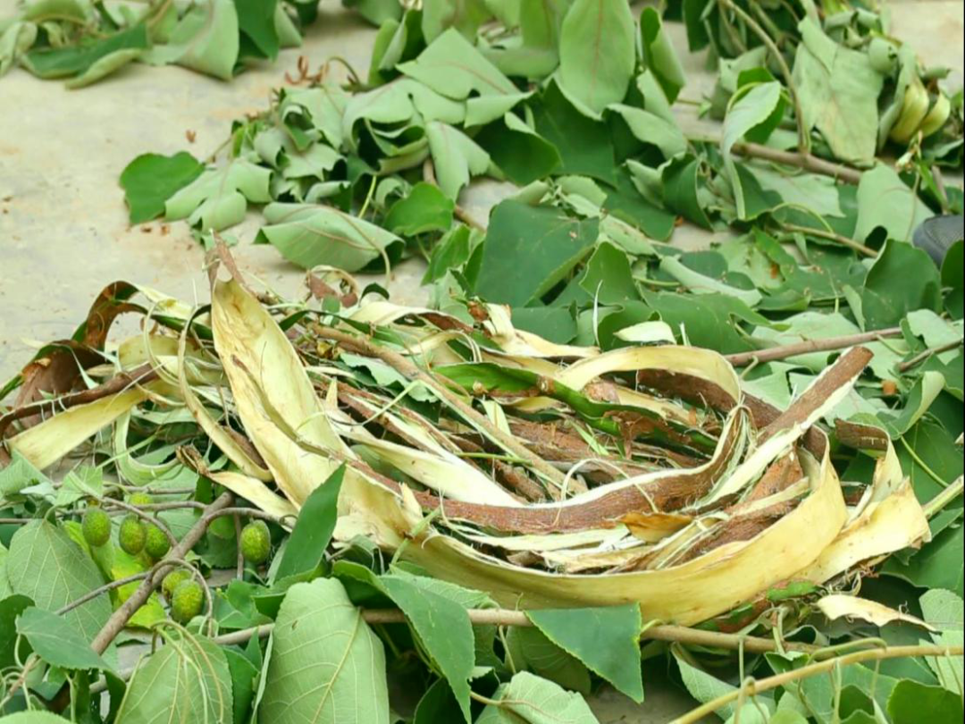 趁日头正好,上山采集麻纸的原材料——构树皮。将构树枝干砍下,剥下树皮,先放至水中浸泡,将适于做纸的纤维软化。