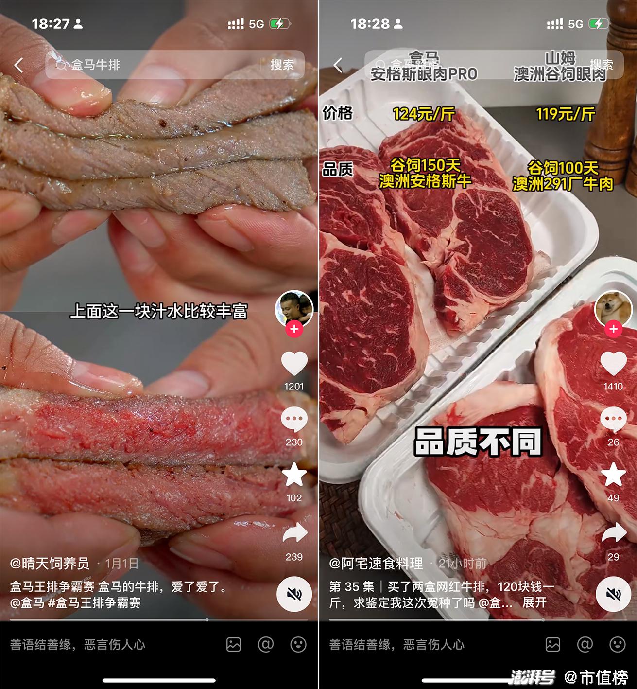 去年8月,盒马发起价格战,年末,价格战烧到了山姆的核心品类——牛肉,近期,盒马又发起了一轮关于牛排品质的“王牌争霸赛”。