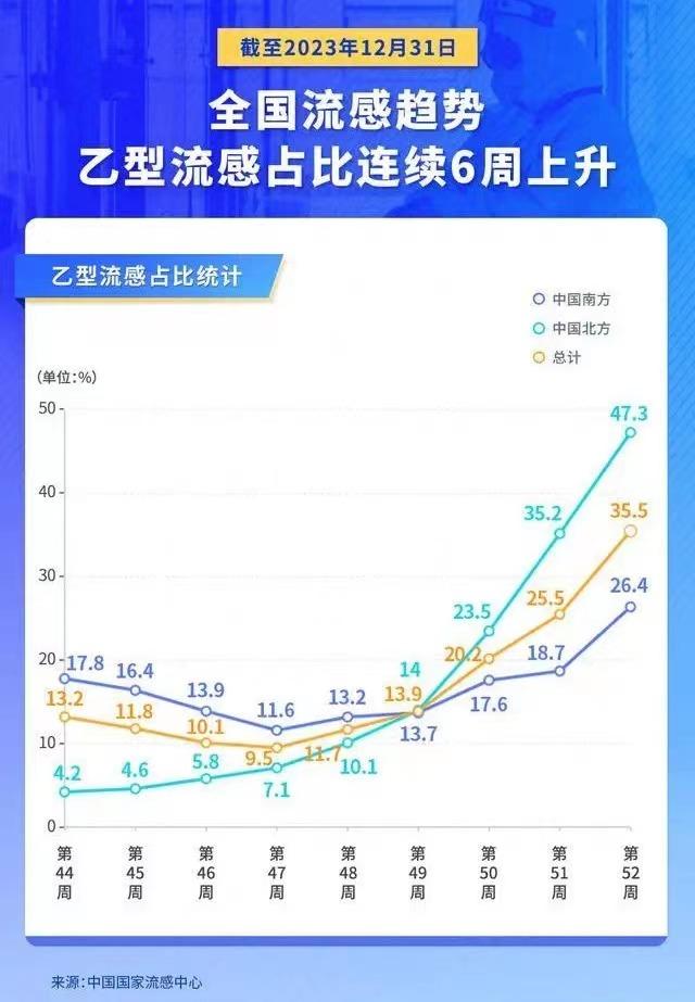 周报中指出,目前我国流感仍以甲流(A型)为主,占到阳性数的64.5%。值得注意的是,近期乙型流感占比有上升趋势,北方已连续9周上升,从第44周4.2%上升至第52周47.3%;南方已连续6周上升,从第47周11.6%上升至第52周26.4%;全国乙型流感占比连续6周上升。
