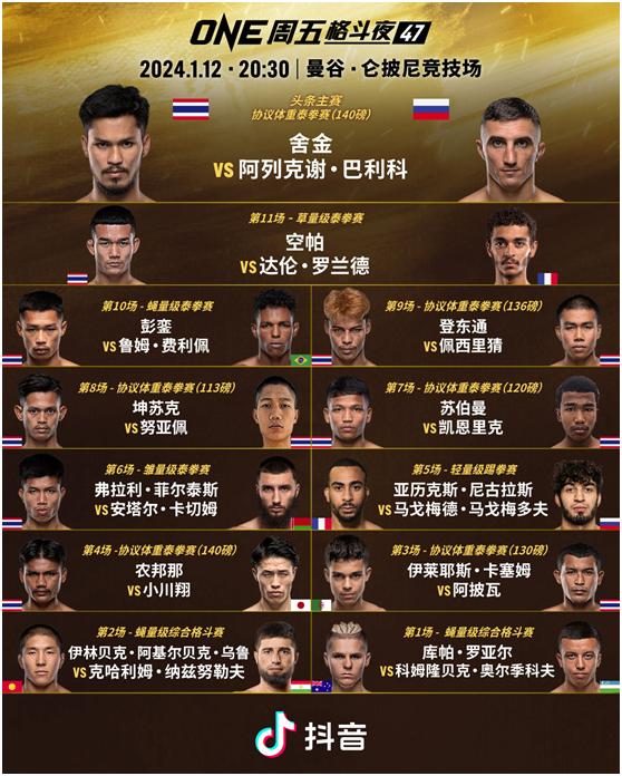2024年1月12日晚八点半,国际知名体育IP--ONE冠军赛将在仑披尼竞技场举办“ONE周五格斗夜47”。这是2024年的开年第一场战斗,当晚12场比赛包括9场泰拳赛、1场踢拳赛以及2场综合格斗赛。