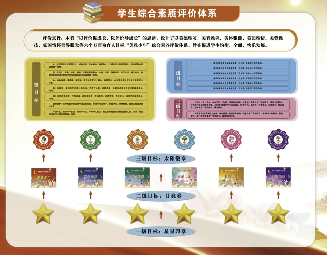 为落实五育并举育人目标,积极构建“美雅少年”综合素质评价体系,从德、智、体、美、劳和国际素养六个方面进行综合评价,分别评选美德、乐学、健体、崇美、勤勉、逐梦美雅少年,以多元评价促学生全面发展。