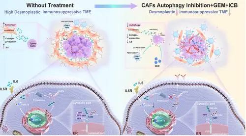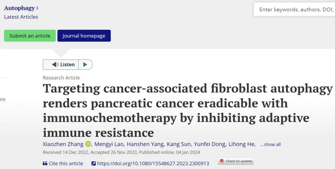 2024年1月4日,浙江大学梁廷波及白雪莉共同通讯在《Autophagy》在线发表题为“Targeting cancer-associated fibroblast autophagy renders pancreatic cancer eradicable with immunochemotherapy by inhibiting adaptive immune resistance”的研究论文,研究揭示了CAF自噬的抑制在免疫缺陷异种移植模型中抑制体内肿瘤发展。这种缺陷削弱了体外和体内抗肿瘤免疫和抗肿瘤效果,通过在免疫能力的小鼠模型中上调CD274/PDL1水平。