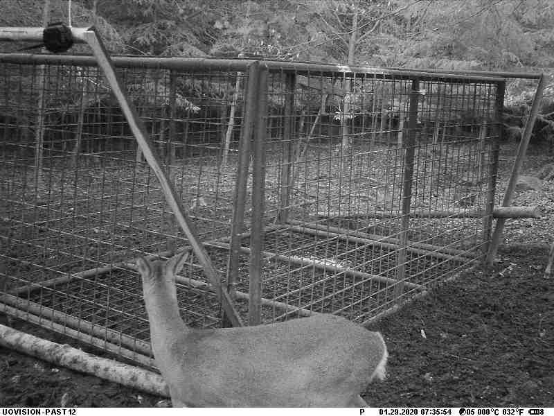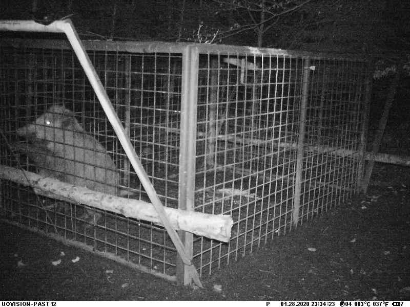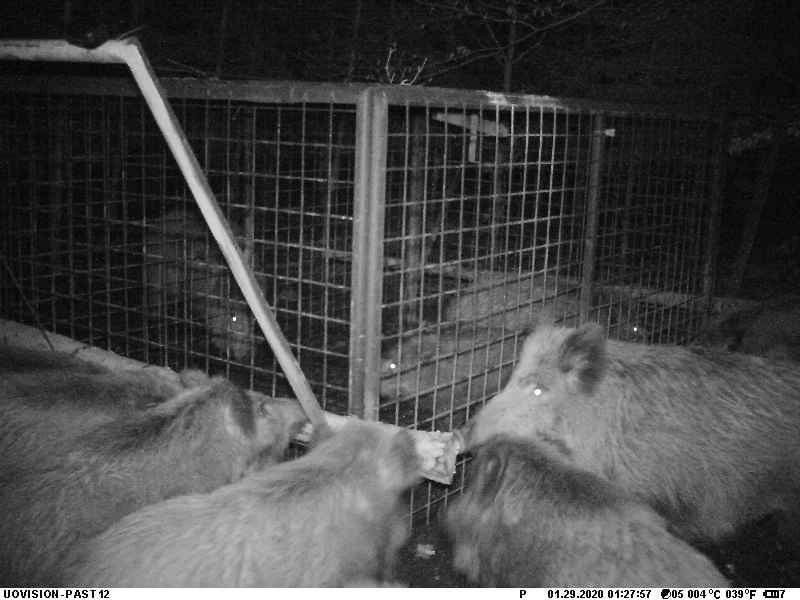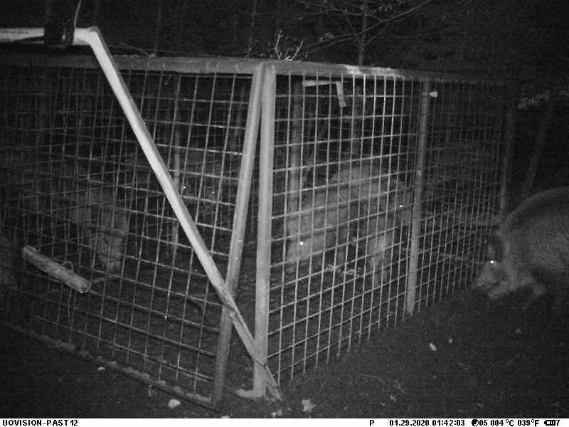 研究人员将相机架在一个简易的野猪诱捕器前,晚上 11:21,两只涉世未深的幼年野猪被玉米棒子吸引,干饭时触发机关,被锁在诱捕器中。