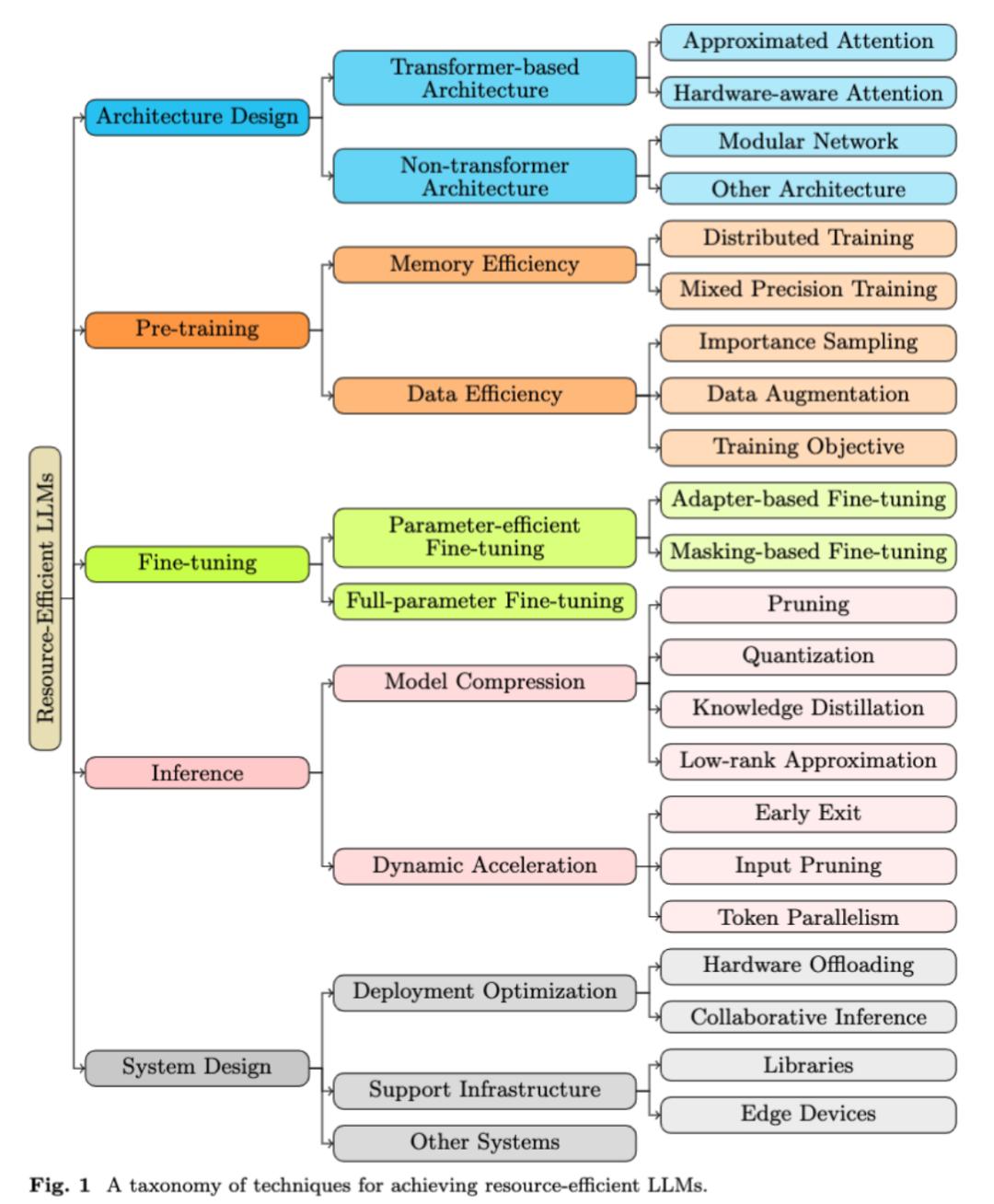 该综述探讨了应用于大型语言模型(LLM)以提升其在不同资源上的效率的多种技术。这些资源包括计算、内存、能源、财务成本和网络通信。每项技术在优化 LLM 资源效率方面扮演着重要角色。
