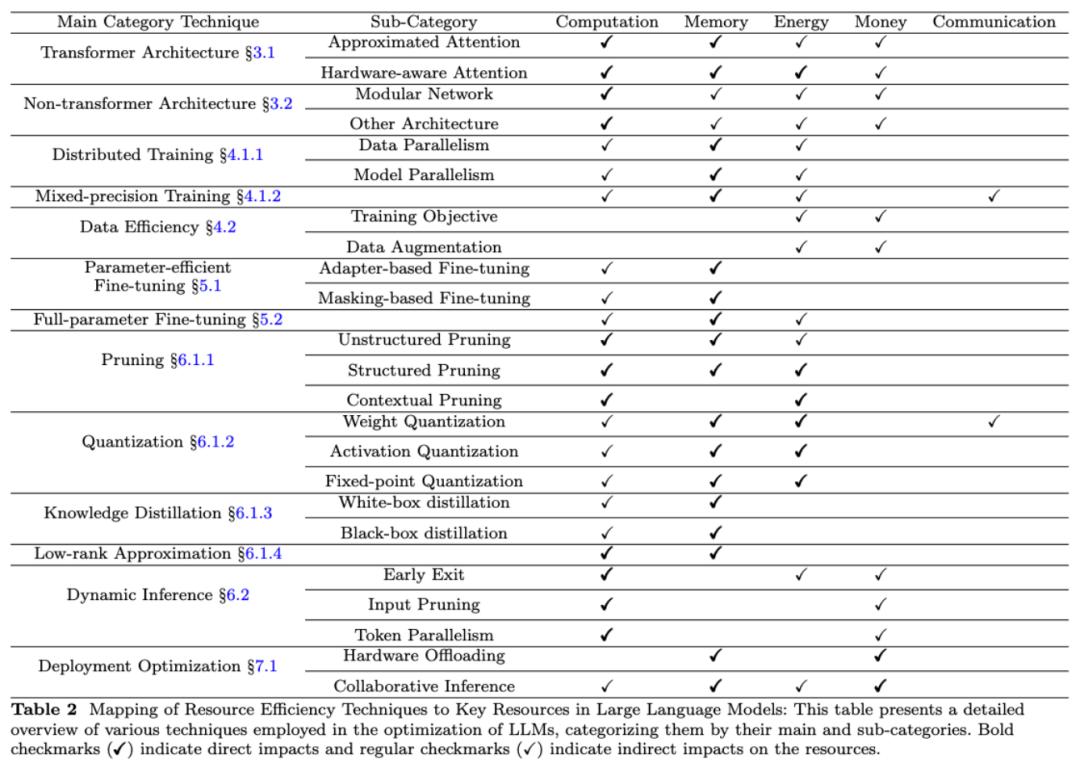 通过这些策略,该综述旨在展示如何通过多种技术提高大型语言模型在各种资源上的效率。详细的技术与资源的对应关系可见下表。