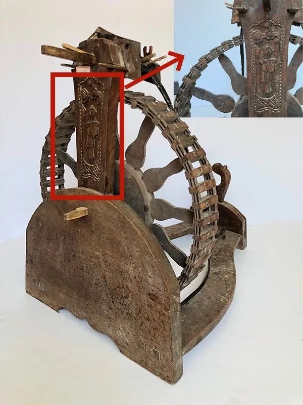 △ 华东师范大学海上风民俗博物馆收藏的三锭纺车,上面雕刻了一位微微弓着背、捧着一匹布的老年女性形象。有学者认为,这可能是目前发现的最为可信的黄道婆像。棉纺织技艺的重大创新
