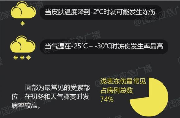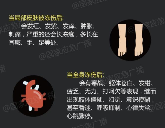 任何皮肤部位的发红或疼痛,都表示冻伤可能已经开始,应尽快从寒冷区域离开或对所有裸露部位的皮肤加以保护。