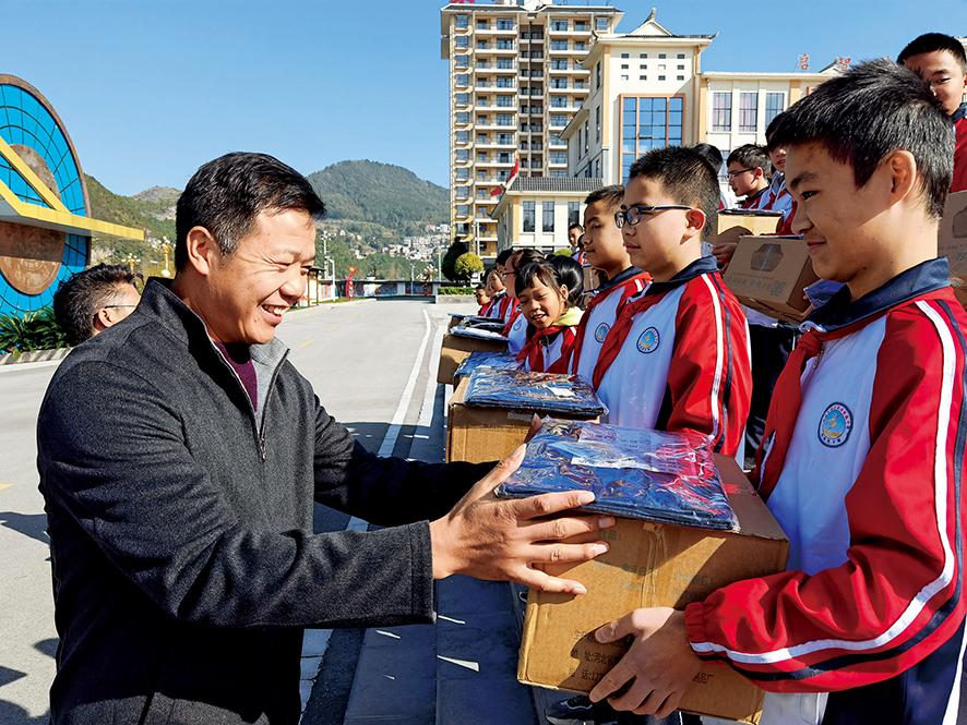 紫云自治县民族高级中学组团式帮扶校长罗平为学生送上捐赠物资(贵州日报天眼新闻记者 / 张赛 摄)