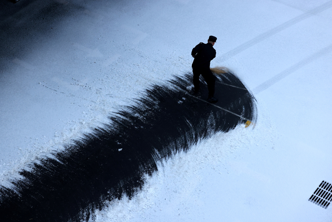 2024年1月16日,山东枣庄,一单位工作人员在清扫大院内的积雪。