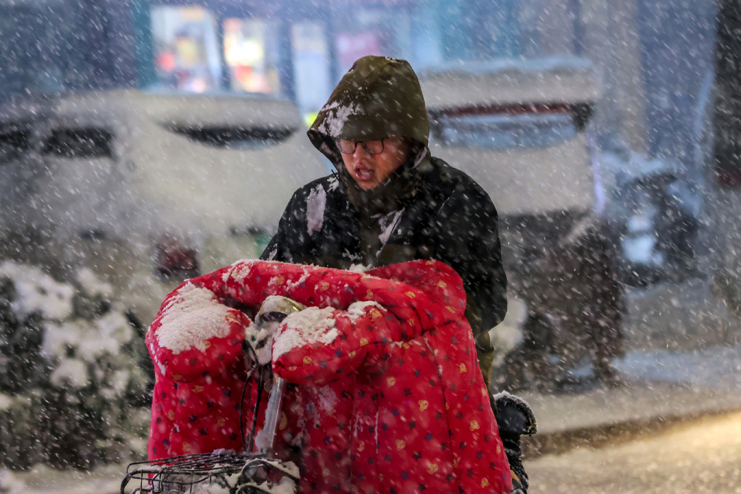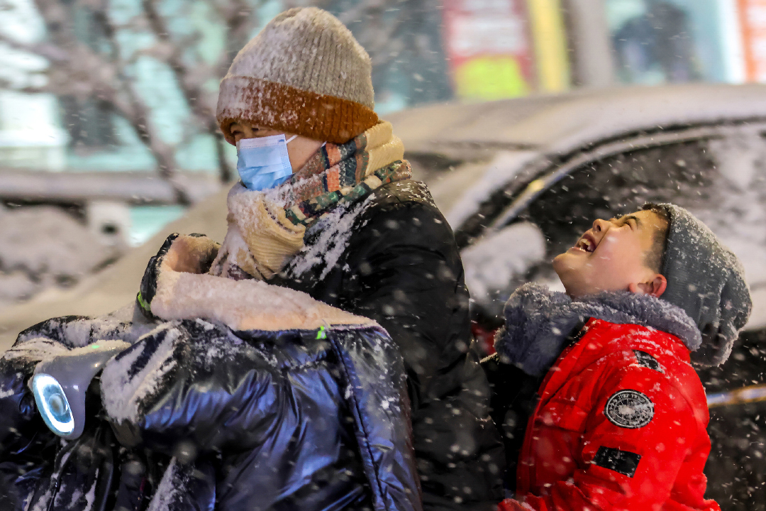 2024年1月15日,河南安阳,滑县街头大雪纷飞,电动车后座的孩童兴奋得仰面看着漫天的雪花。