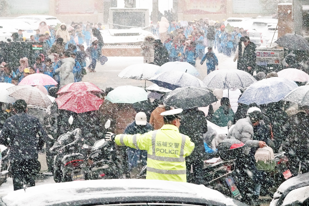 2024年1月15日,山西运城,新绛县公安交警大队古城中队一名民辅警(前)在西街实验小学周边冒着大雪有序指挥疏导交通,护航小学生平安放学回家。