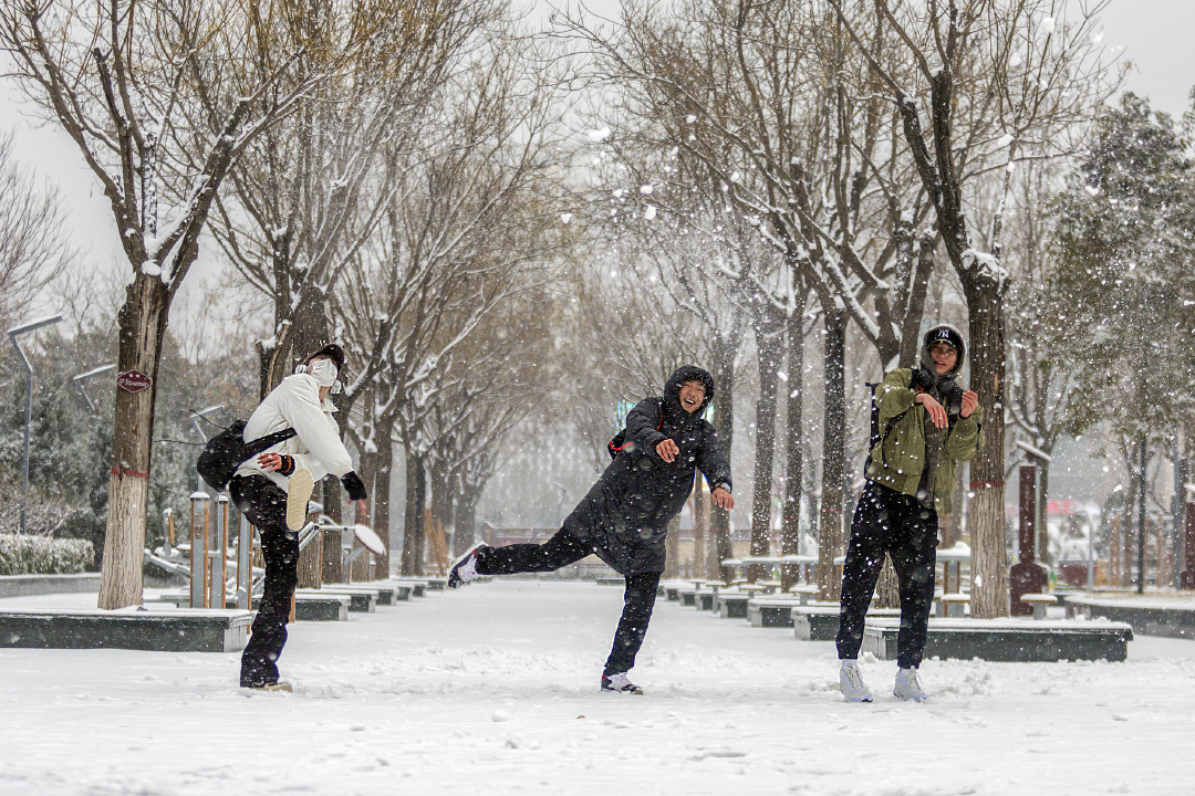 2024年1月15日,山西省运城市迎来第一场雪,盐湖区居民们正冒雪南风广场戏嬉玩雪。