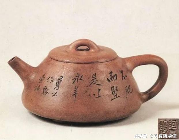 陈曼生从画中东坡石铫获得启发,在造型上进一步改进,创制出了⼀款形似瓢器的铫壶,由此开启石瓢类紫砂壶的制作。