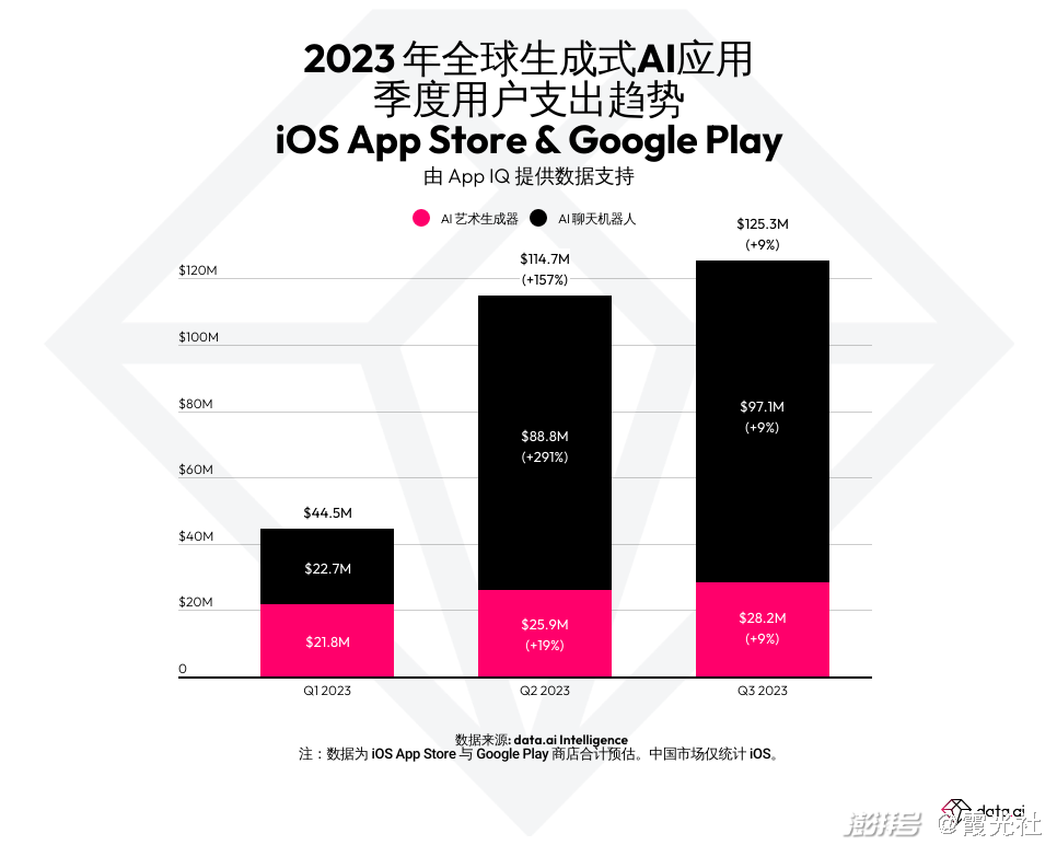 在大部分人的认知里,AI聊天应用赛道属于某些亚文化情境下”圈地自萌"的小众应用,但data.ai数据显示,2023年前三季度,全球范围内,该类别应用用户支出已达2.08亿美元,AI聊天APP已经从小众赛道演变为极具爆发潜力的新范式。